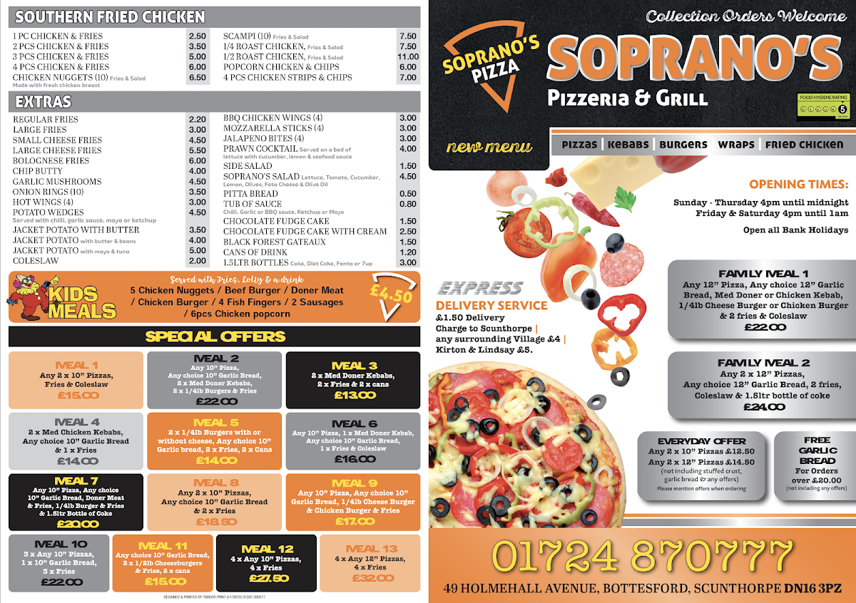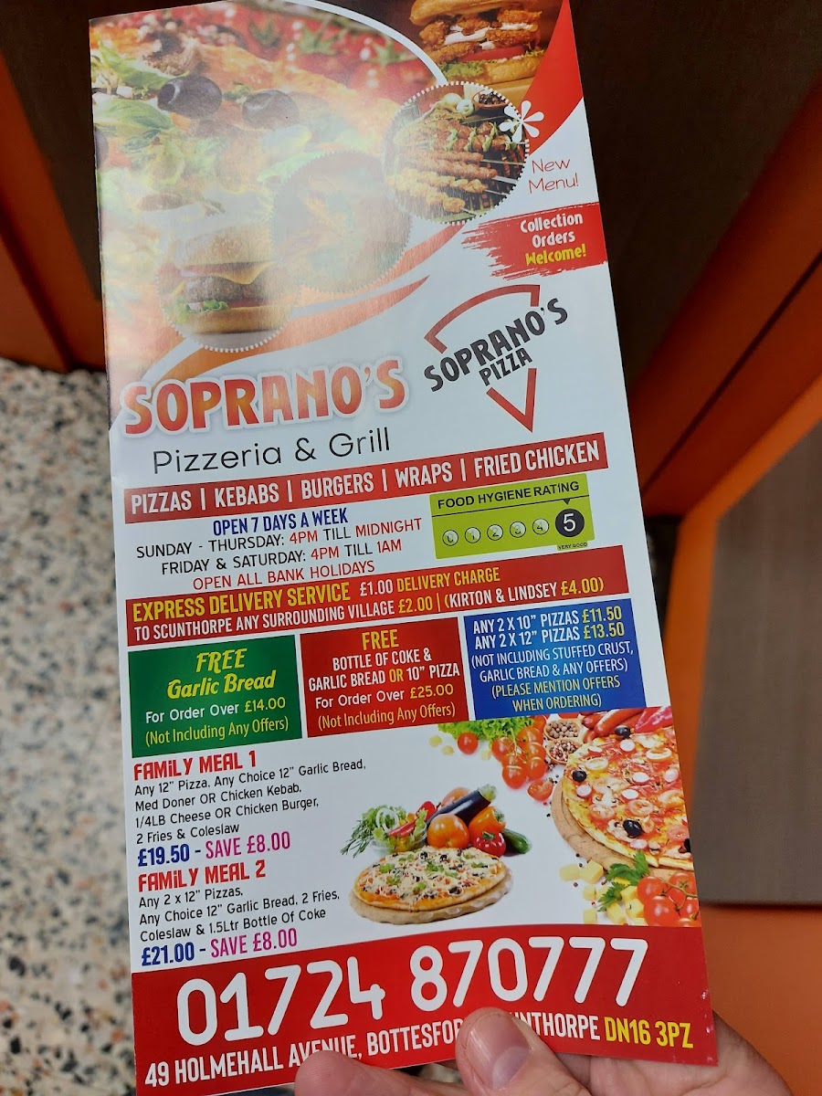 Customers consistently praise the generous portions, prompt delivery, and friendly service, with deals that bring great value—such as two pizzas, garlic bread, and chips for just £17. Soprano's delivers hot, flavorful meals that keep patrons coming back, making it a gem in Scunthorpe’s fast-food scene.